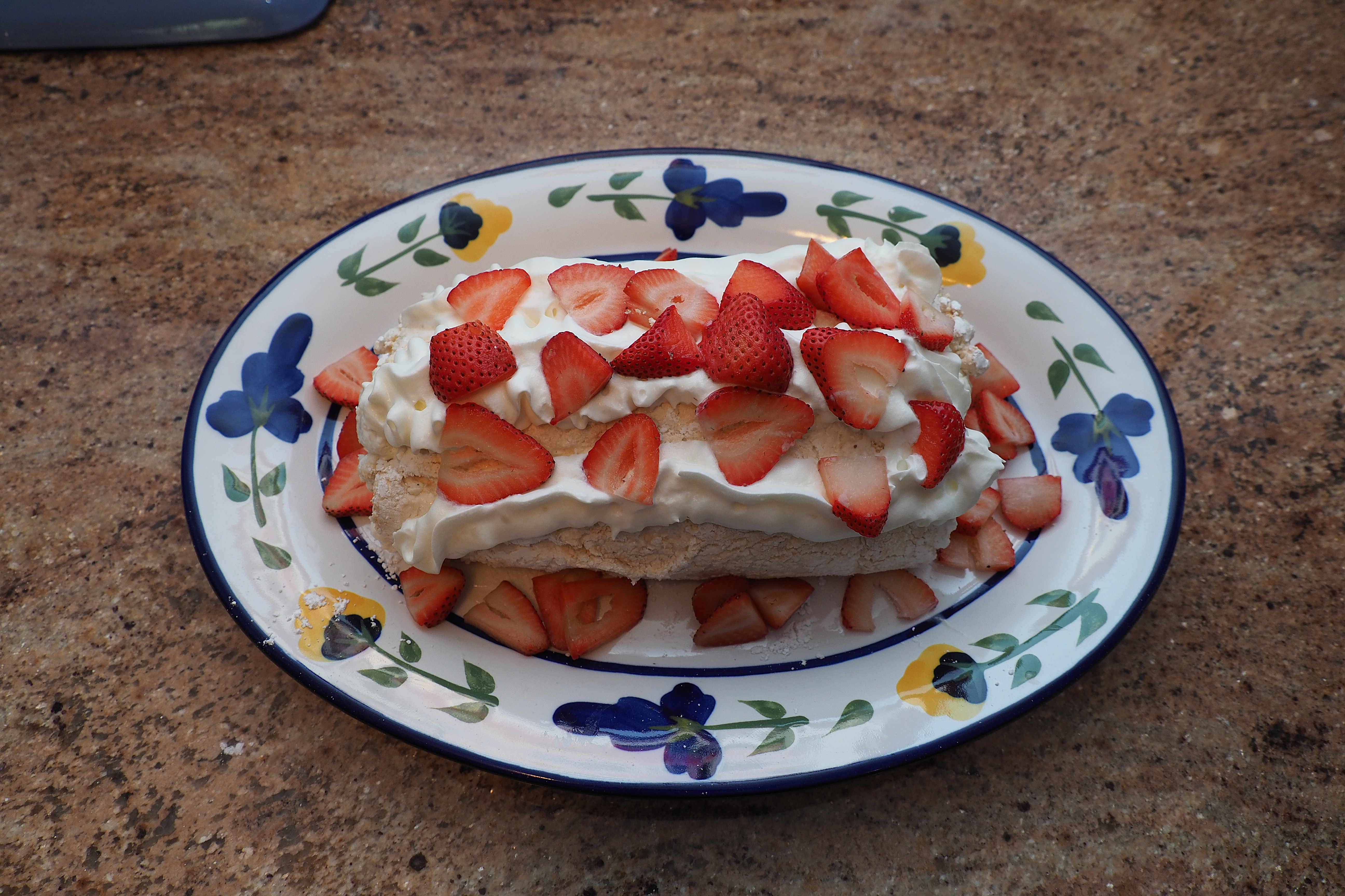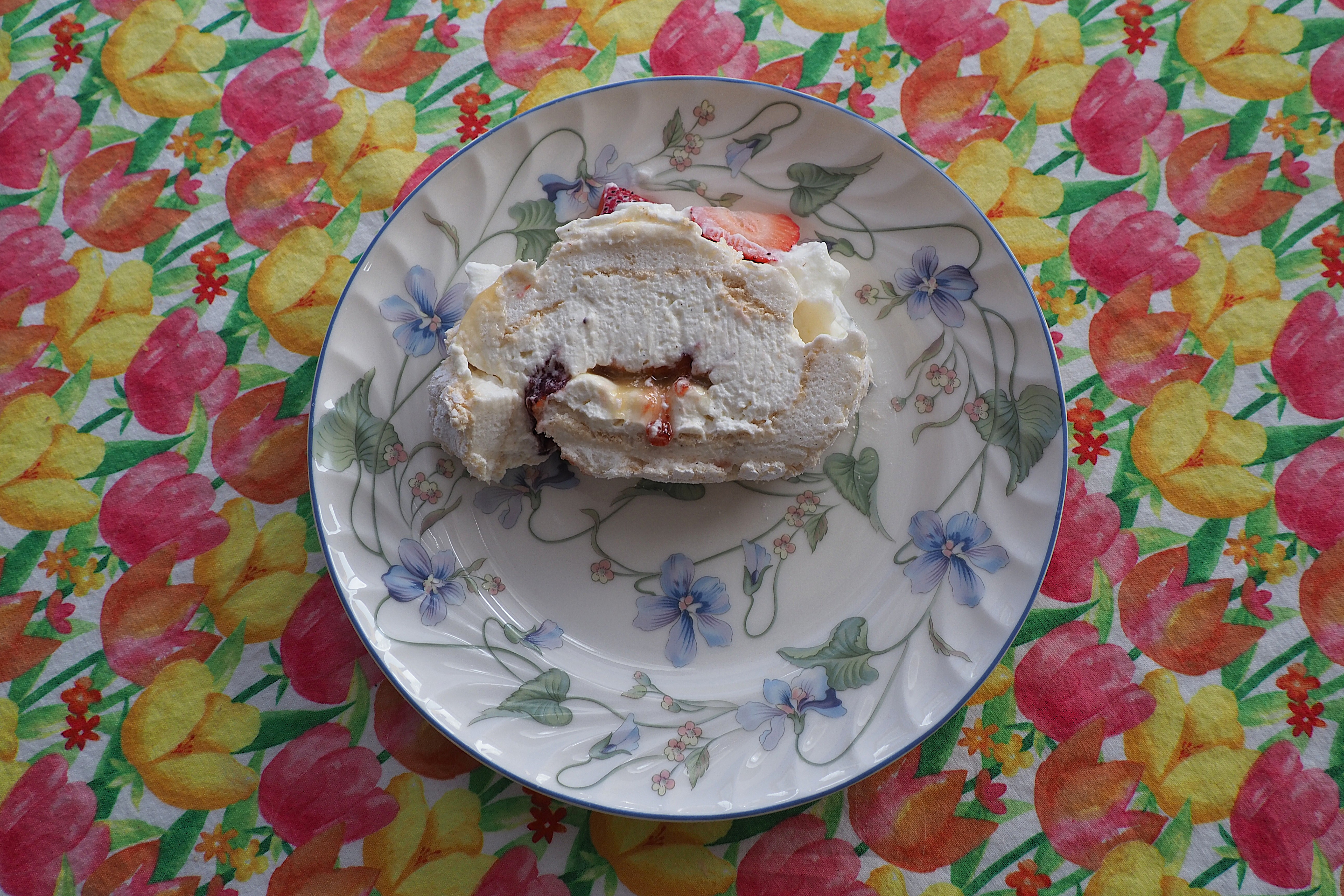 Two fun and tasty treats that are naturally gluten free, both from Sally’s Baking website. The meringue roulade, or rolled and filled meringue, was a fun baking project for two, with a baked meringue filled with a mixture of sweetened whipped cream and cream cheese, and then with dollops of lemon curd and berry jam, and finally rolled and topped with whipped cream (this time from a can) and sliced strawberries. I used a smaller pan than the recipe specified, so it didn’t have as big a spiral as it might have. Still absolutely delicious, and perfect for spring.