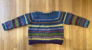 There is a whole chapter on blue dyes, including indigo and woad, and their histories. I was rather surprised Peggy chose to use insect or animal based red dyes, and didn’t consider leaving any of the wool undyed. Finally, it’s time to design her sweater with help via video consultations. While she easily picked her base color of blue, and then decided the order and placement of various colors of striped yarn, in the end Peggy doesn’t shape the sweater at all to follow the contours of her body, keeping it very boxy. This isn’t what many sweater designers would do, but Peggy shares her very personal reasons.